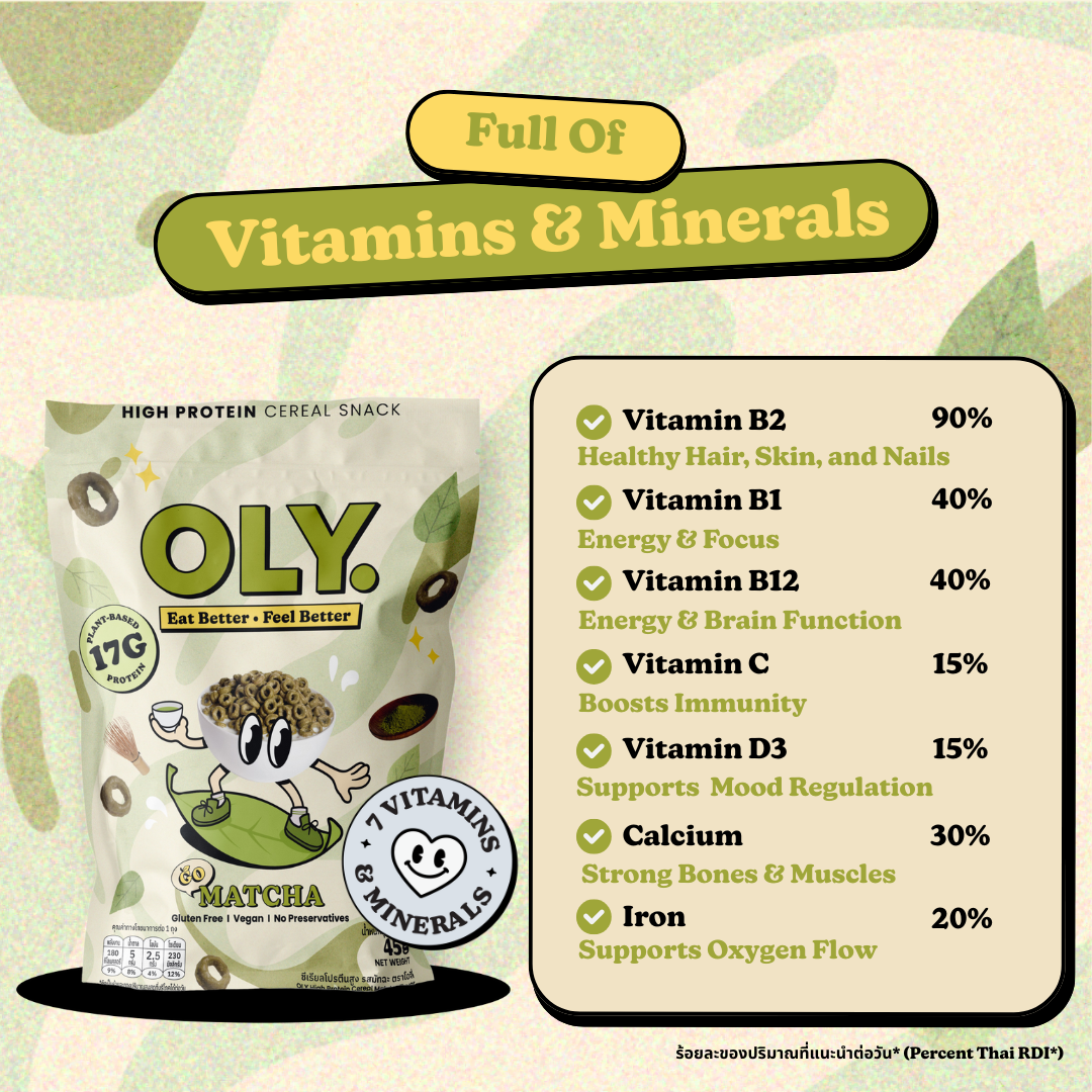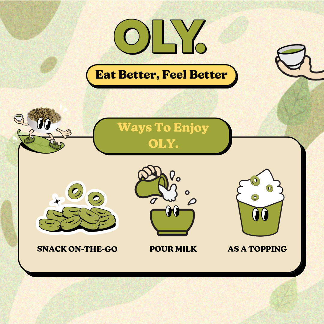 Crunchy loops with a smooth, earthy matcha flavor in every bite. Balanced yet wholesome, it's a taste that's as unique as it is delicious. Best part? Each serving has 17g of Protein and a rich source of Vitamins C, D, B12, Iron and Calcium. OLY. Go is also Vegan, Gluten-Free, and Contains No Preservatives.