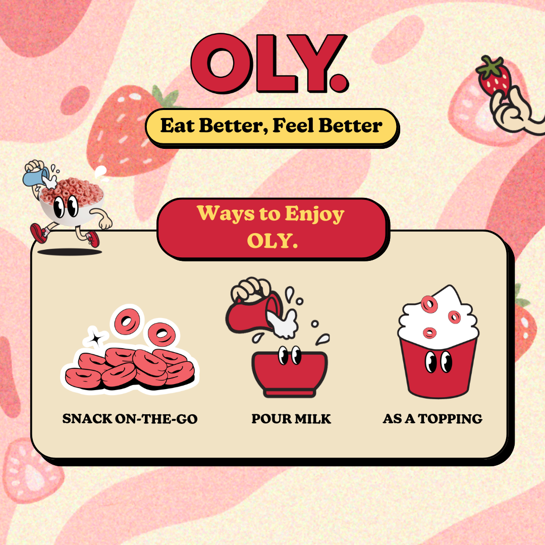 Sweet and fruity loops bursting with the taste of strawberries. A bright, refreshing flavor that's as fun as it is delicious. Best part? Each serving has 17g of Protein, only 2g of Sugar, and a rich source of Vitamins C, D, B12, Iron and Calcium. OLY. Go is also Vegan, Gluten-Free, and Contains No Preservatives.
