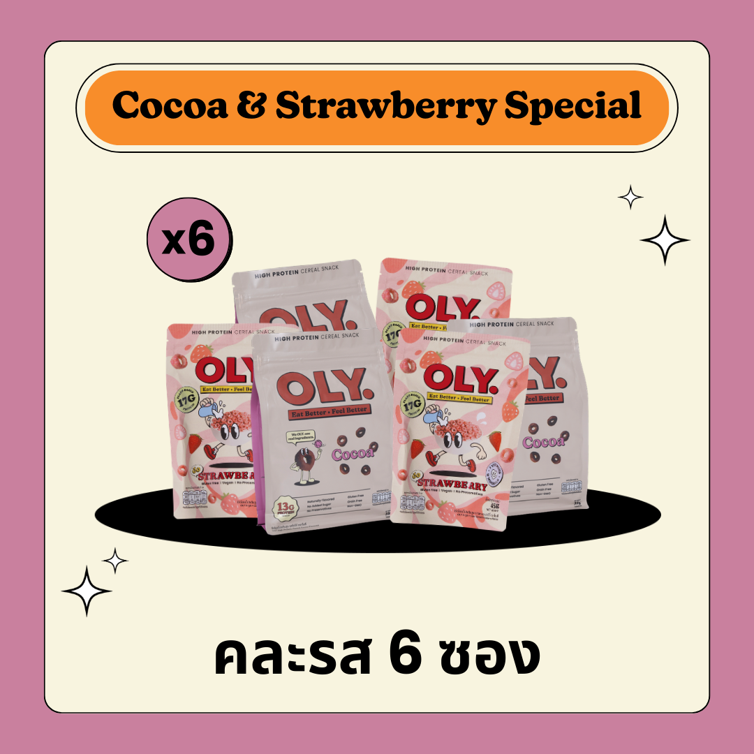 โอลี่ ซีเรียล โปรตีนสูง รส โกโก้ 35g และ สตรอเบอร์รี่ 45g (เซ็ต 6 ถุง)